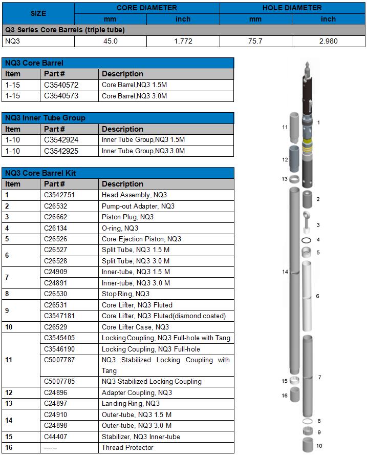 Core Barrel,NQ3 1.5M Core Barrel,NQ3 3.0M Inner Tube Group,NQ3 1.5M Inner Tube Group,NQ3 3.0M Head Assembly, NQ3 Pump-out Adapter, NQ3 Piston Plug, NQ3 O-ring, NQ3 Core Ejection Piston, NQ3 Split Tube, NQ3 1.5 M Split Tube, NQ3 3.0 M Inner-tube, NQ3 1.5 M Inner-tube, NQ3 3.0 M Stop Ring, NQ3 Core Lifter, NQ3 Fluted Core Lifter, NQ3 Fluted(diamond coated) Core Lifter Case, NQ3 Locking Coupling, NQ3 Full-hole with Tang Locking Coupling, NQ3 Full-hole NQ3 Stabilized Locking Coupling with Tang NQ3 Stabilized Locking Coupling Adapter Coupling, NQ3 Landing Ring, NQ3 Outer-tube, NQ3 1.5 M Outer-tube, NQ3 3.0 M Stabilizer, NQ3 Inner-tube Thread Protector NQ to NQ3 Conversion Kit, 1.5 M NQ to NQ3 Conversion Kit, 3.0 M Split Tube, NQ3 1.5 M Split Tube, NQ3 3.0 M Stop Ring, NQ3 Core Lifter, NQ3 Fluted Core Lifter Case, NQ3 Core Ejection Piston, NQ3 O-ring, NQ3 Piston Plug, NQ3 Pump-out Adapter, NQ3 NQ3 Core Barrel Spare Parts Kit Spearhead Point,NQ3 Compression Spring,NQ3 Detent Plunger,NQ3 Spiral Pin,7/16" X 1" Spring Pin, 1/2" x 2" Nylok Bolt 3/8" -16UNC x 3/4" Compression spring Latch, NQ3 Link, NQ3 Spring Pin, 1/2" x 1-1/2" Stainless Steel Ball, 22mm Indicator Bushing Landing Shoulder, NQ3 Hex Nut, 1-1/8" UNC Shut-off Valve, NQ3 Thrust Bearing Spindle Bushing, NQ3 Hanger Bearing Lock Nut Hydraulic Grease Fitting Stop Ring, NQ3 Core Lifter, NQ3 Fluted Core Lifter Case, NQ3 O-ring, NQ3 Landing Ring, NQ3 Stabilizer, NQ3 Inner-tube